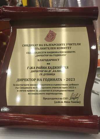 Директорът на Детска градина “Калина” в Дупница Райна Хаджийска спечели приза “Директор на годината 2023” в Националния конкурс, организиран от Синдиката на българските учители. Наградата се връчва за постигнати високи резултати в съвместната дейност със СБУ през годината и личен принос за развитие и усъвършенстване на социалното партньорство.