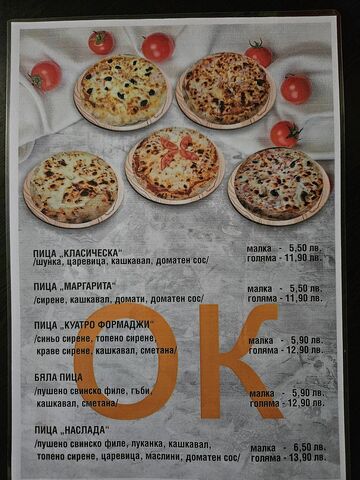 Богатият асортимент включва супи, свежи салати, основни ястия, вкусни десерти, сандвичи, алкохолни и безалкохолни напитки, с проверено качество и на достъпни цени. За любителите на италианската кухня е подготвено специално меню с класически пици. Заведението е сред най-предпочитаните и за организирани детски, фирмени или други партита.