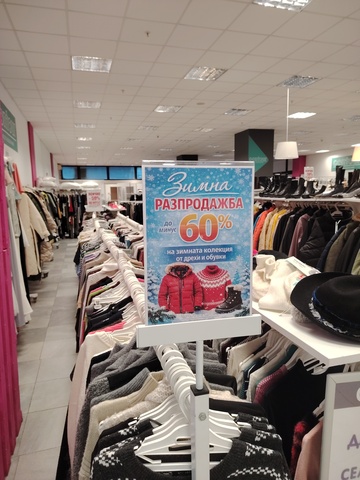 На половин цена можете да изберете стилни и елегантни модели от целия асортимент аутлет, а отново 60% отстъпка изкушават да си изберете зимни дрехи, боти и ботуши. Изобилието от официални рокли, сака, ризи, връхни дрехи за дамите, панталони, сака, якета, блузи и ризи за господата, както и богатият избор на спортни облекла и битов текстил привличат все повече любители на истинското и доказано качество.