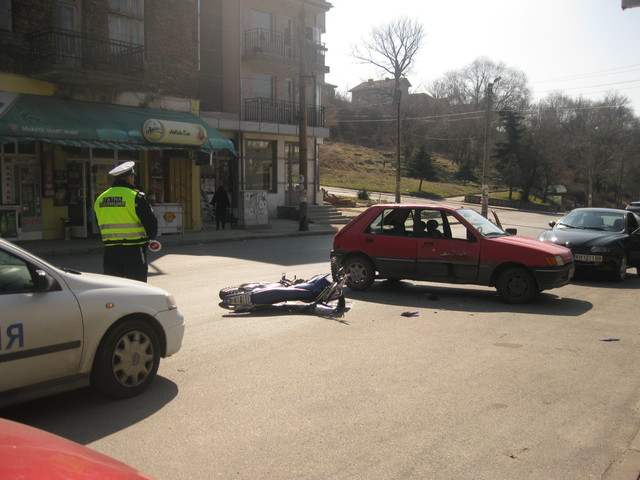 19-годишен моторист пострада при катастрофа днес в Дупница. Асен Джаферов бил засечен около обяд, на главната улица “Св. Иван Рилски”, близо до разклона за жп-гарата, от лек автомобил Форд Фиеста. Той е закаран в Спешна помощ, откъдето съобщиха, че няма сериозни травми. Тестът с дрегер за алкохол на мястото на инцидента е показал отрицателни резултати и на двамата водачи.