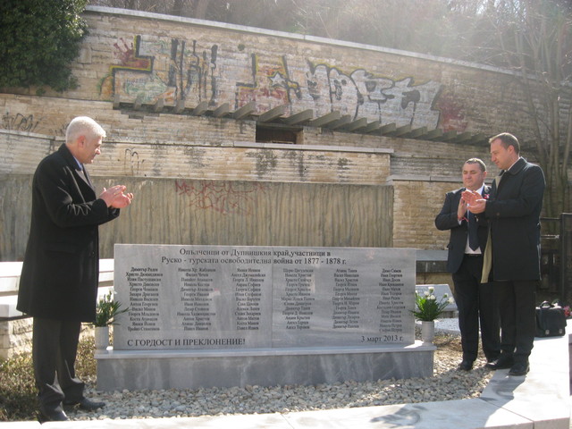 Паметна плоча на дупнишките опълченци бе открита навръх националния празник пред Дома на техниката. Стотици граждани се събраха днес, за да отдадат почит на дупничани, жертвали се за свободата на България преди 135 години. Паметната плоча откриха кметът Методи Чимев и председателят на Общинския съвет Ивайло Константинов. На събитието присъстваха заместник кметовете Красимир Георгиев и Крум Милев, както и народният представител от ГЕРБ Емил Гущеров. Героичните събития от руско-турската освободителна война и участието на 79 дупничани в нея, припомни краеведът Иван Хаджийски. Венци пред паметната плоча бяха поднесени от местната управа, политически партии и Орденът на тамплиерите.