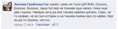 Учителката по история от Гимназията по облекло и стопанско управление в Дупница, която се прочу с расисткото си изявление в социалната мрежа, е излязла в отпуск преди два дни. Директорът на учебното заведение пък е в болнични. Нейният заместник Люси Димитрова отказа да коментира дали е обсъждан въпросът с налагане на дисциплинарно наказание за преподавател, публично проповядващ расизъм и омраза. Постът на учителката по история Анелия Груйчева от Дупница стана популярен в интернет, след като студентът по журналистика Георги Иванов го публикува и коментира в блога си. Той е по повод скандалната снимка на трима ученици от ромски произход, подиграли се с портретите на трима видни българи.„Учителка си позволява да призовава към смърт на деца? Тази същата учителка отговаря за възпитанието и живота на учениците по време на часовете си. Не знам що за ценности трябва да имаш, за да напишеш нещо такова публично. Още повече ако си възрастен човек, и то учител. Та тези тримата на снимката и те имат учител по история в училище. Ако учителят им се отнася към тях както тази госпожа, не съм изненадан, че не знаят кои са лицата от портретите и се снимат по такъв начин”, споделя Георги Иванов. Според него, на Анелия Груйчева от Дупница, както и на нейна колежка от Шумен с подобно изявление, трябва да се потърси и наказателна отговорност. Съгласно чл. 162 ал. 1 от Наказателния кодекс, „който чрез слово, печат или други средства за масова информация, чрез електронни информационни системи или по друг начин проповядва или подбужда към дискриминация, насилие или омраза, основани на раса, народност или етническа принадлежност, се наказва с лишаване от свобода от една до четири години и с глоба от пет хиляди до десет хиляди лева, както и с обществено порицание.”