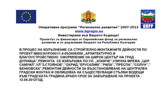 Настоящата публикация е изготвена с финансовата помощ на Оперативна програма "Регионално развитие". Община Дупница носи цялата отговорност за съдържанието на настоящата публикация и по никакъв начин не може да се приеме като официална позиция на Европейския съюз и Договарящия орган.
