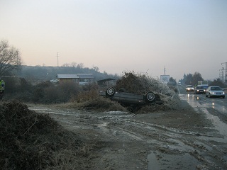 Лек автомобил се преобърна рано тази сутрин на главен път Е-79, на изхода на Дупница в посока Благоевград. Причината за инцидента е заледен участък от пътя и несъобразена скорост. Заледяването пък е вследствие от теч наблизо. Водачът не е пострадал, съобщиха от полицията. На мястото има две патрулни коли, а екипи на Пътно поддържане са сигнализирани за обезопасяване на участъка.