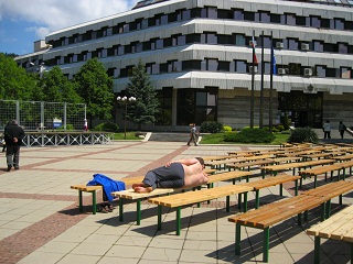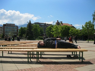 Съблечен до кръста и дремещ върху пейка мъж събра погледите на дупничани на площада днес по обед. Подмамен от поставените за предстоящите Майски празници на културата пейки, мъжът пренесе обедната си почивка на пъпа на града, изтягайки се върху една от тях.