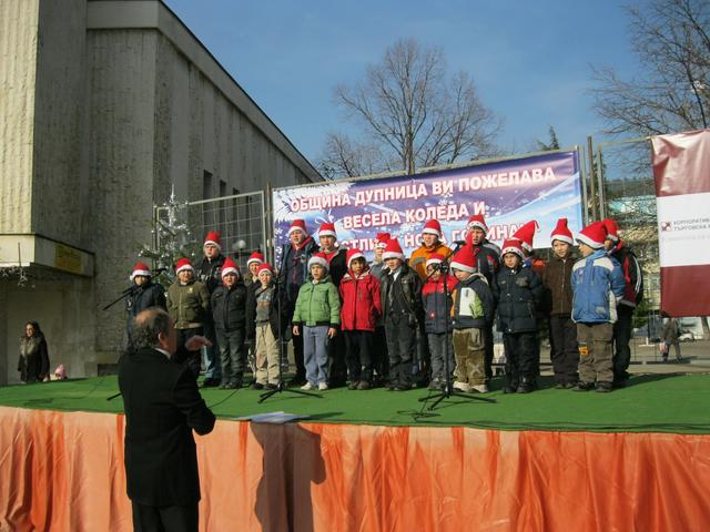 Най-талантливите деца на града зарадваха с изпълненията си дупничани днес. В празничния коледен концерт на площад “Свобода”, организиран от кметството, се включиха младите певци от Хора на момчетата “Канон”, с ръководител Иван Гатев. Коледното настроение подгряха и малките танцьорки от балет “Дъга” към читалище “Зора”. Ръководените от Анита Дюлгерова момичета на възраст от 6 до 13 години, демонстрираха уменията си по модерен балет и спортни танци. Вокална група “Сладурите” изпълниха любимите на децата коледни и новогодишни песни, а бурните аплодисменти на публиката заслужиха и момчетата от “Денс машийн”. Коледната програма на общината продължава днес в 17,30ч. в етнографския музей Жельова къща, с пресъздаване на обичаите, характерни за Бъдни вечер. Организатори са ОУ “Св. Климент Охридски” и читалище “Христо Ботев”.