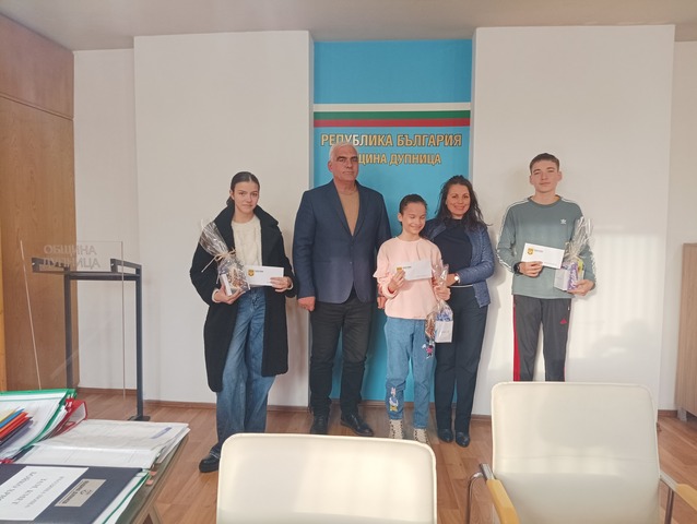 Стипендиите от последната сесия за подпомагане на даровити деца бяха връчени в община Дупница. Кметът Първан Дангов и зам.-кметът Валентина Караганова поздравиха отличените за високите им постижения и им пожелаха още много успехи занапред. Стипендии получиха Дария Таушанска за отличното си представяне на национални и международни състезания по математика,