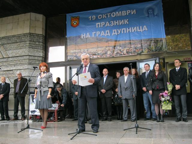 С тържествено издигане знамето на Дупница започна празничната програма по случай празника на града. Гости на празника днес бяха Сергей Чернов, аташе при посолството на Руската федерация, народният представител от РЗС Димитър Чукарски, зам.-областният управител Даниела Годинова, кметове на съседни общини, общински съветници. Здраве, благополучие, сили за хубавите и лошите моменти пожела на съгражданите си кметът Атанас Янев.