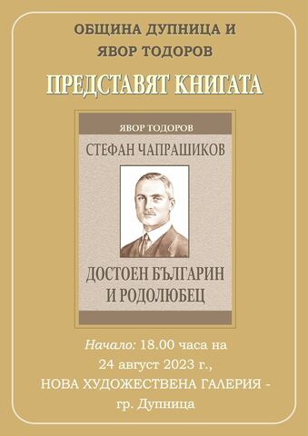 Най-новата си книга представя Явор Тодоров на 24 август от 18ч. в Новата художествена галерия в Дупница. “Стефан Чапрашиков. Достоен българин и родолюбец” е подробно историческо изследване на живота на един незаслужено позабравен дупничанин от иначе популярната местна фамилия Чапрашикови. “Допреди издаването на тази книга Дупница беше в дълг на това значимо име от национална и международна величина”, каза за Dupnicanews.EU авторът Явор Тодоров. С документи и богат снимков материал, който ще бъде подреден в специална фотоизложба, той проследява жизнения път и заслугите за България на Стефан Чапрашиков.