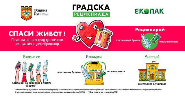 Община Дупница и ЕКОПАК България започват съвместна кампания „Градска рециклиада“. Мисията е спасяване на природата от стотици тонове отпадъци и осигуряване на животоспасяваща първа помощ при внезапен сърдечен арест. Инициативата се провежда в 14 общини в България от март до декември 2023 г. под мотото: „Рециклирай пластмасовите бутилки и метални кенове - Спаси живот!“.