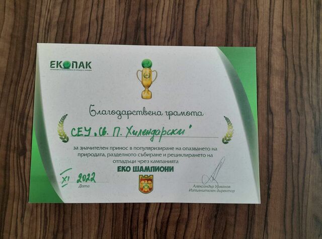 СЕУ “Св. Паисий Хилендарски” спечелиха първото място в кампанията “Екошампиони”, организирана от “Екопак”. В инициативата взеха участие над 16 000 ученици от 34 училища на общините Пловдив, Враца, Дупница, Хасково и Вършец. Заедно те събраха над 12 тона отпадъци, които ще бъдат рециклирани вместо да замърсяват българската природа.