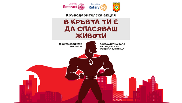 Кръводарителска кампания организира местната структура на Ротаракт в Дупница. Тя ще се проведе на 22 октомври (събота) от 10 до 15ч. в Заседателната зала на общината. Мотото на кампанията е “В кръвта ти е да спасяваш животи” и се провежда за пета година. Партньори са община Дупница, Отделението по трансфузионна хематология към Областната болница в Кюстендил и Ротари клуб – Дупница.