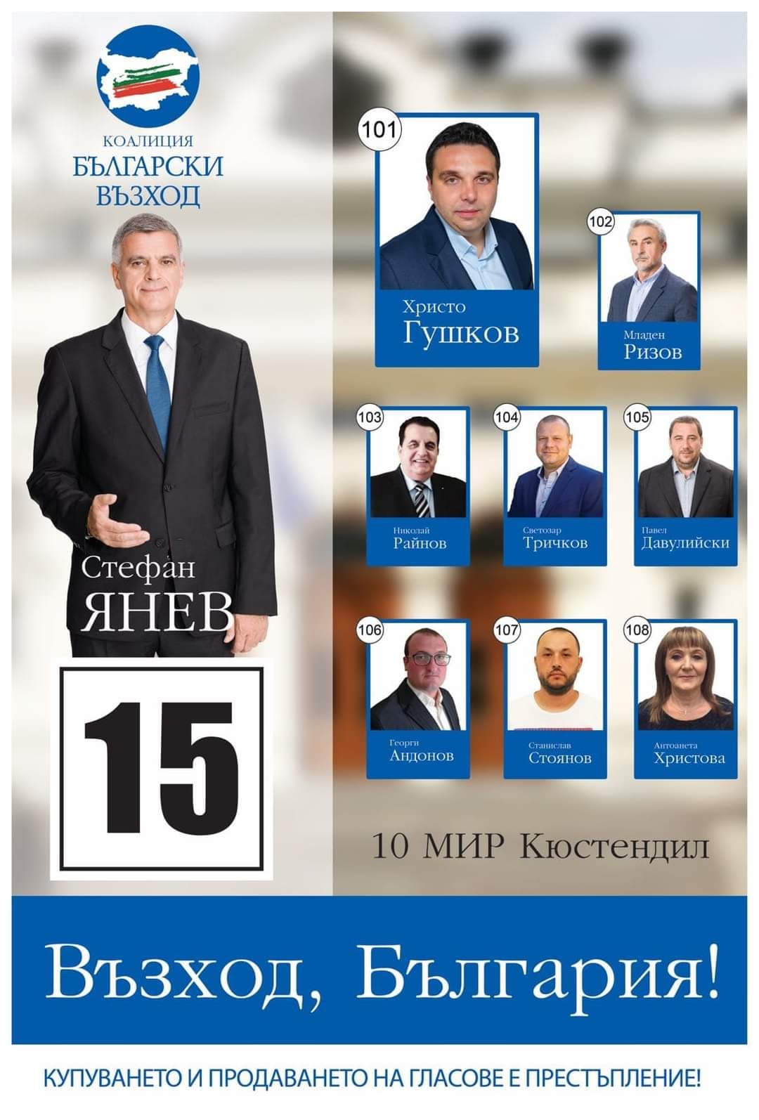 Лидерът на партия “Български възход” Стефан Янев ще посети Дупница на 28 септември (сряда). В 17,30ч. той ще бъде на площад “Свобода”, за да разговаря с дупничани и да им представи приоритетите за бъдещо управление. Заедно с бившия служебен премиер и военен министър в центъра на Дупница ще бъдат и всички кандидати за народни представители от Кюстендилска област от листата с №15 в бюлетината. В нея Дупница е представена от юриста Светозар Тричков, който е и общински съветник от “Народен съюз” - коалиционен партньор на “Български възход”. Неговият преференциален номер е 104.