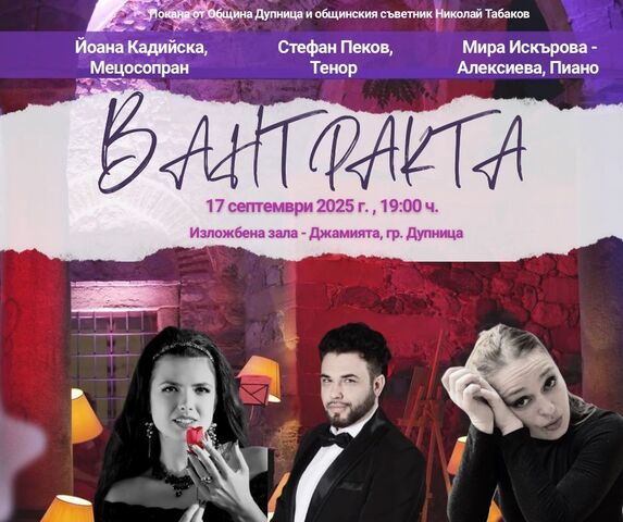 Оперетен концерт “В антракта” между лятото и есента ще зарадва любителите на музиката в Дупница тази вечер. Организатор е общинският съветник и творец Николай Табаков, който финансира събитието със свои средства и с подкрепата на приятели.