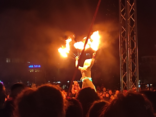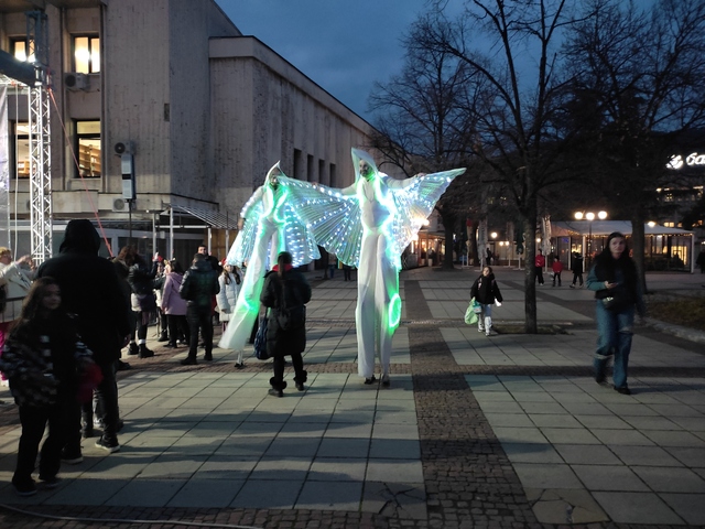 Пожелания за весели празници и щастлива 2025 година към съгражданите си отправи от сцената кметът Първан Дангов, придружен от две момиченца. След общо обратно броене от 10 до 1 грейна елхата, а заедно с нея вечерното небе засия от красива заря. По традиция на площад „Свобода“ пристигнаха и кукерите от село Джерман. Около коледното дръвче те изиграха традиционния си ритуален танц за прогонване на злите сили.