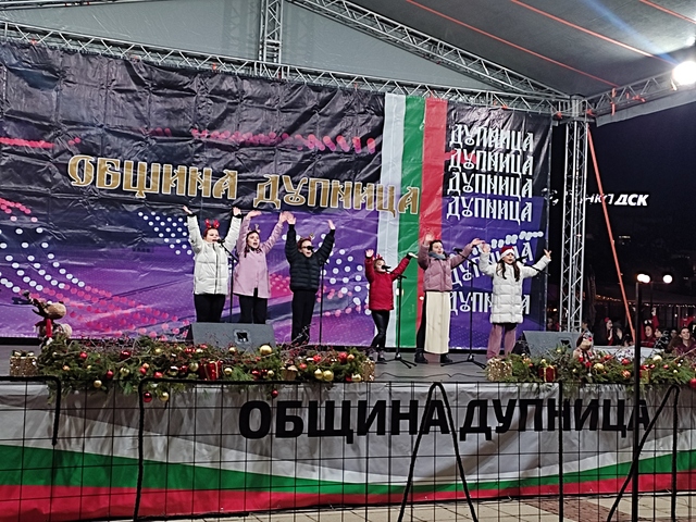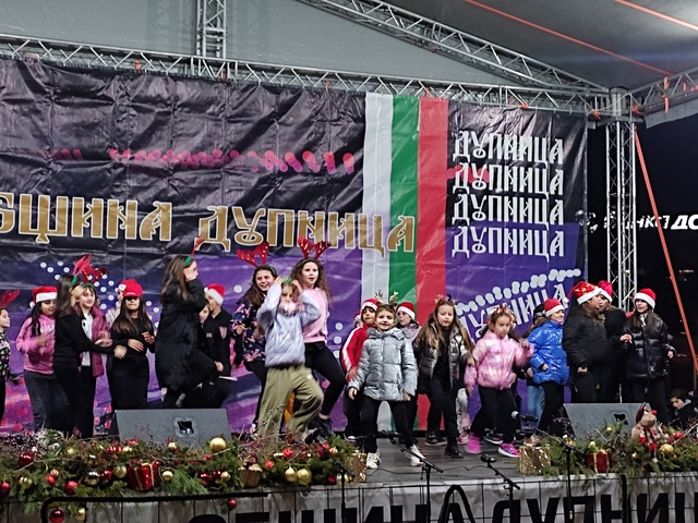 Коледните светлини озариха тази вечер площад „Свобода“ в Дупница. Тон на празничното настроение в навечерието на Рождество Христово дадоха малките изпълнители от вокална група „Арт поп“, които с много усмивки пяха коледни песни.