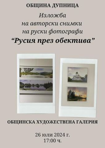 Изложба с пейзажи “Русия през обектива” представя Община Дупница на 26 юли. Експозицията включва снимки на изтъкнати руски фотографи. Тя е част от организирания през 2017 г. фотоконкурс "Моят руски свят. С голяма прецизност, авторите на изложбата са подбрали най-характерните за духа и културата на Русия кадри - пейзажи, стари руски църкви и храмове, бита в автентични стари руски селища и съвременните руски градове. Откриването е в 17ч. на 26 юли в Общинската художествена галерия.